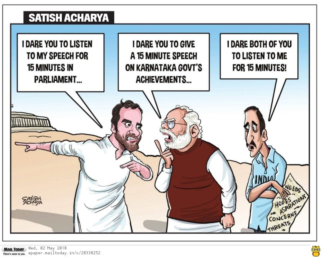 Satish Acharya in Mail Today suggests that Rahul Gandhi and Narendra Modi should listen to common people rather than daring each other to various tasks.