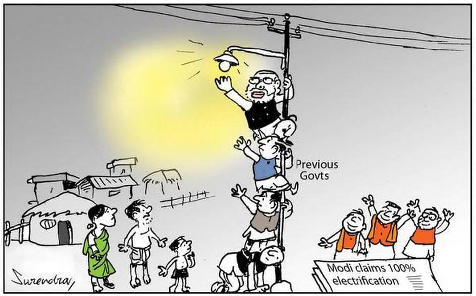 Surendra in The Hindu mocks the fact that the Modi government took credit for electrifying all villages in India given many governments have worked towards this goal since Independence.