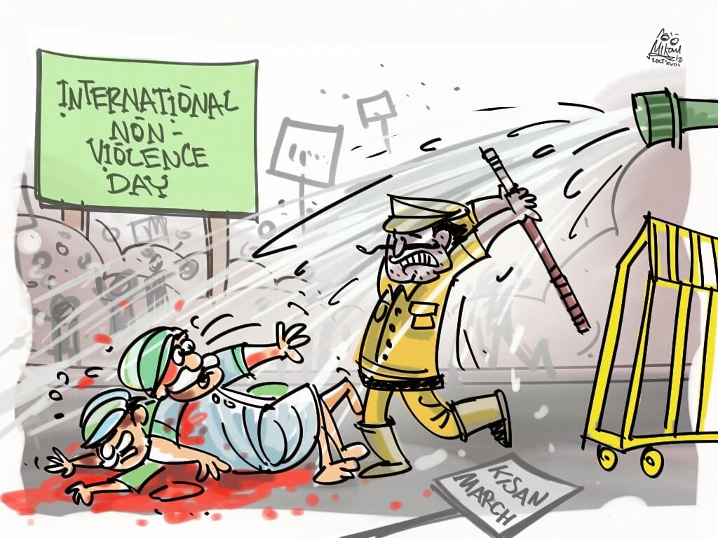 Mika Aziz points out the irony of a police lathicharge against protesting farmers on the birth anniversary of Mahatma Gandhi, whose doctrine of non-violence has inspired the world.