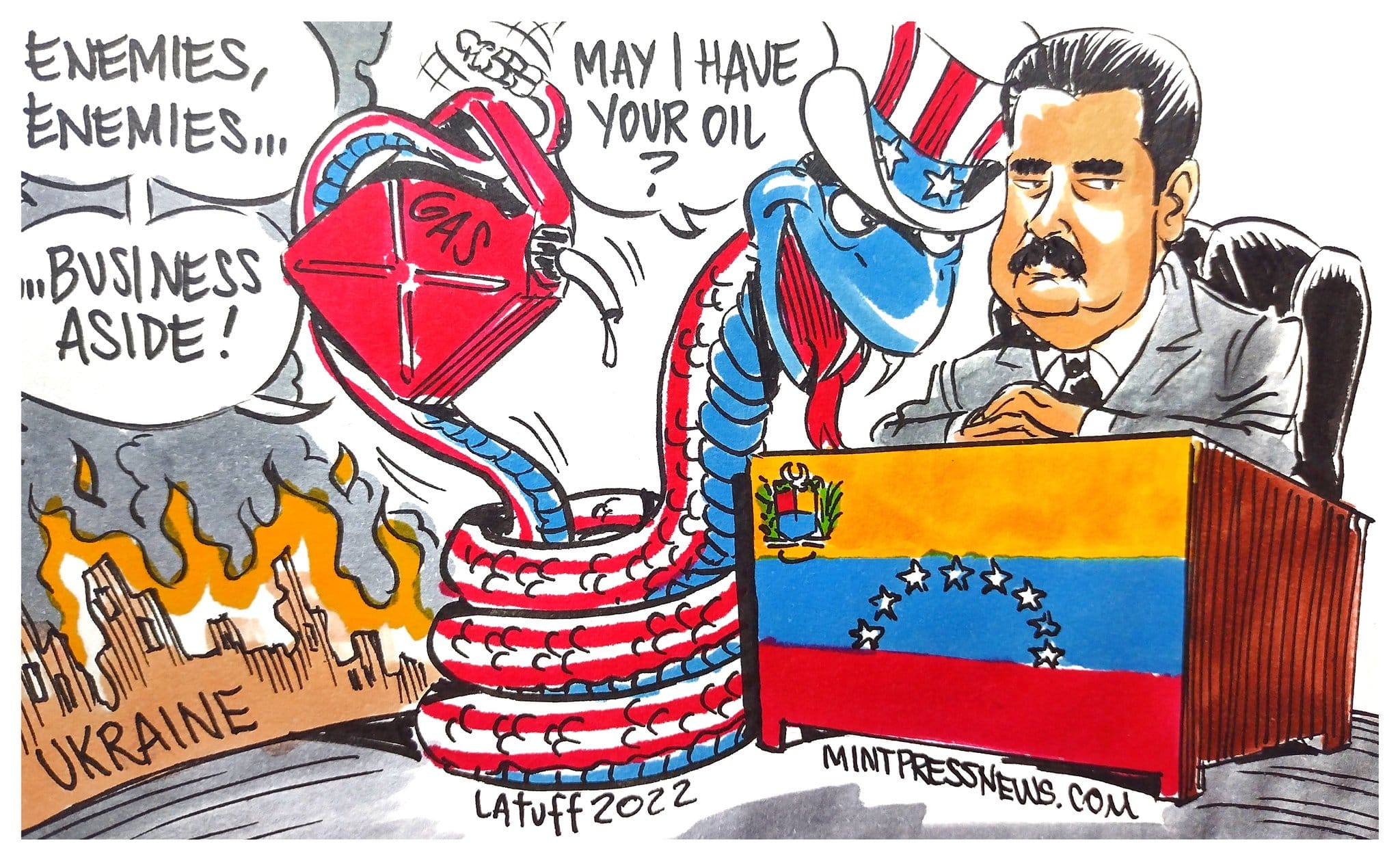 Carlos Latuff highlights the efforts being made by the US to reach out to Venezuela, an ally of Russia with which Washington has poor relations, to boost global crude oil supplies. This comes amid a sharp oil price rise triggered by sanctions imposed on Russia following its invasion of Ukraine. Biden administration officials met Venezuelan President Nicolás Maduro — who the US does not officially consider the legitimate president — and discussed the possibility of easing sanctions on Venezuelan oil exports.