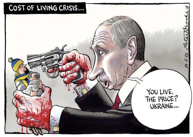 Also alluding to the UK’s cost of living crisis, Peter Brookes refers to Putin’s aim to reduce Ukraine to subservience, while the human cost of the war rises. As of 23 March, there had been at least 977 civilian casualties, including 81 children, according to the UN. Both sides are also thought to have suffered major military casualties.