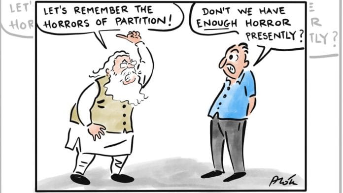 In today’s featured cartoon, Alok Nirantar takes a dig at Prime Minister Narendra Modi’s recent announcement to observe 14 August as “Partition Horrors Remembrance Day” to suggest that “present horrors” are being overlooked by the Modi government.