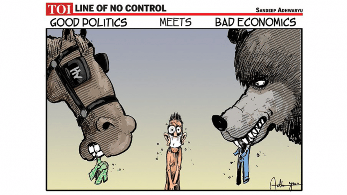 In today’s featured cartoon, Sandeep Adhwaryu takes a dig at the current state of ‘good politics’ in light of the horse-trading in Madhya Pradesh after Jyotiraditya Scindia’s defection to BJP, and ‘bad economics’, which refers to the recent stock market crashes due to coronavirus.