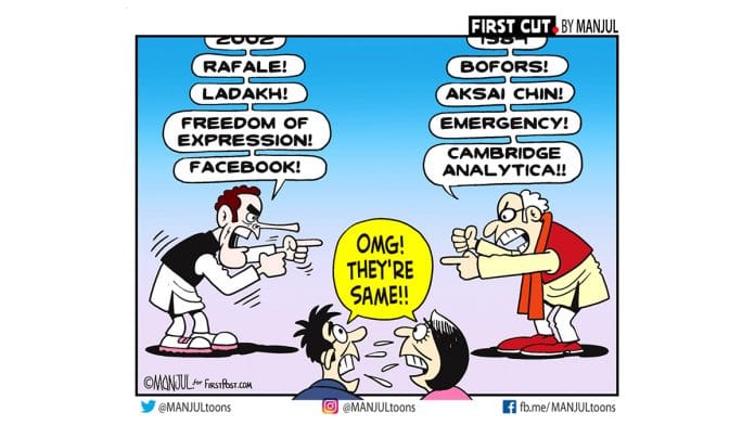 In today’s featured cartoon, Manjul takes a dig at both BJP and Congress over the long list of controversies they have both courted and how they keep attacking each other.
