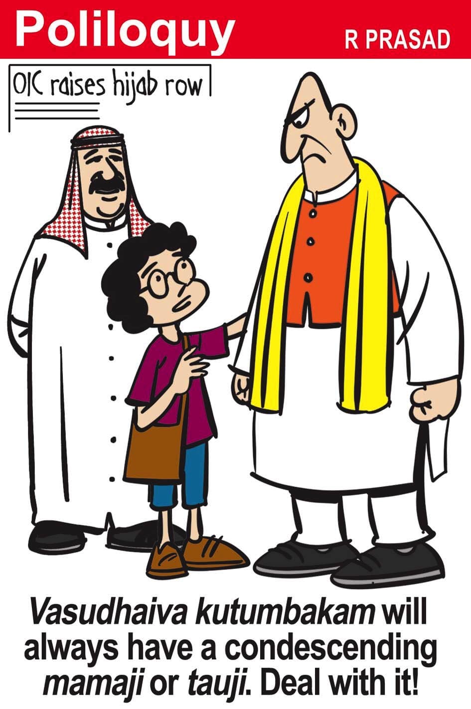 R. Prasad refers to the Organisation of Islamic Cooperation’s (OIC) comments on the ongoing row over the hijab being banned in educational institutions in Karnataka. The group of 57 Muslim countries expressed “deep concern” over the controversy, which was dismissed by India. Vasudhaiva kutumbakam (‘the world is one family’) is a Sanskrit phrase that’s much favoured by the government, while mamaji and tauji are Hindi words for ‘uncle’.