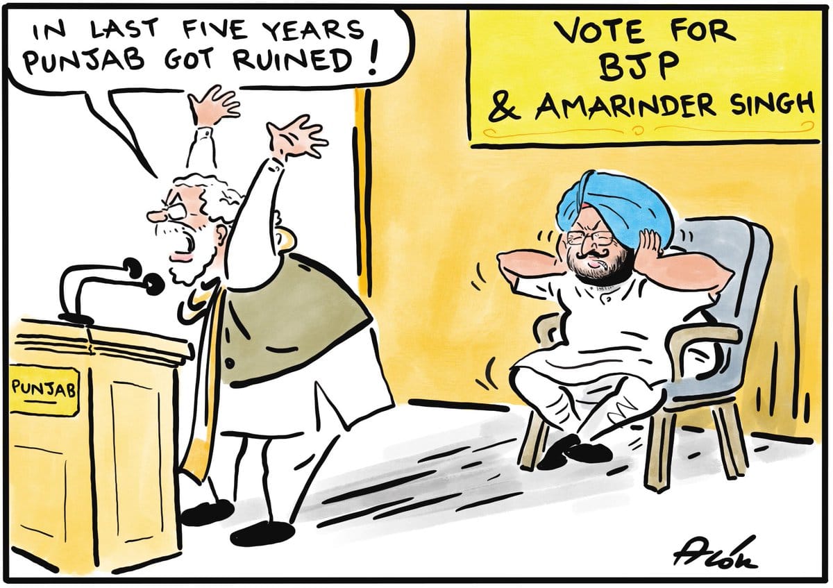 Alok Nirantar depicts Prime Minister Narendra Modi launching an attack on the Congress in Punjab during his rally in Jalandhar Monday. Modi was accompanied by Captain Amarinder Singh, now the BJP’s ally who, before quitting the Congress last year, was chief minister of Punjab for 4.5 years out of the current government’s five-year tenure.