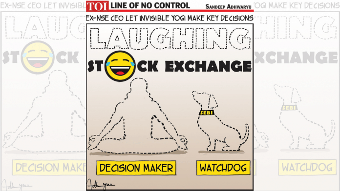 In today’s featured cartoon, Sandeep Adhwaryu mocks the revelation that an ex-CEO of the National Stock Exchange (NSE), Chitra Ramakrishna, was consulting a faceless ‘yogi’ — whom she had never met — over email to make key business decisions during her tenure from 2013 and 2016 , and leaking confidential information to him. This came to light as part of a six-year probe by the market regulator, the Securities and Exchange Board of India (SEBI), which is also not spared by the cartoonist.