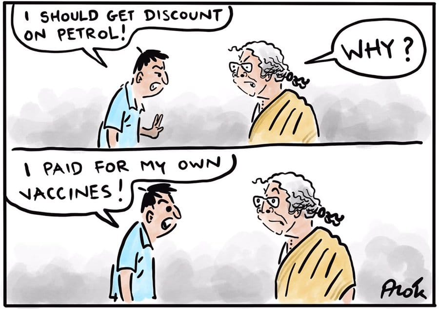 Alok Nirantar takes a jibe at the government’s efforts to justify the skyrocketing fuel prices by saying the money was needed for public expenditure, like free vaccinations.