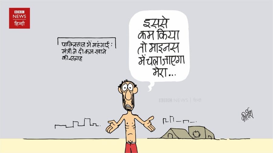 Kirtish Bhatt comments on the uncontrollable inflation in Pakistan and Federal Minister Ali Amin Gandapur advising people to “put less sugar in tea and eat less bread” to combat it. The citizen in the cartoon says if he reduces his intake any further, it’ll go into negative.