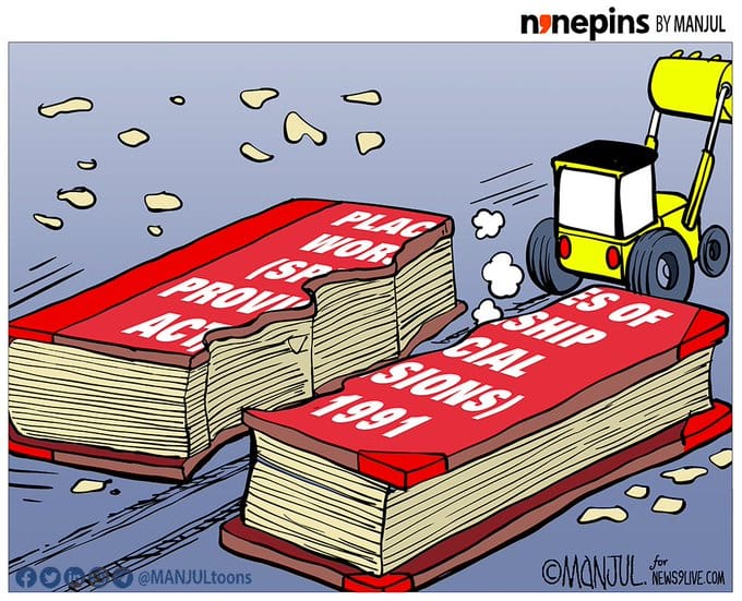 Manjul illustrates a bulldozer tearing through the Places of Worship (Special Provisions) Act, a 1991 legislation that prohibits conversion of any place of worship and provides for the maintenance of its religious character as it existed on 15 August, 1947.