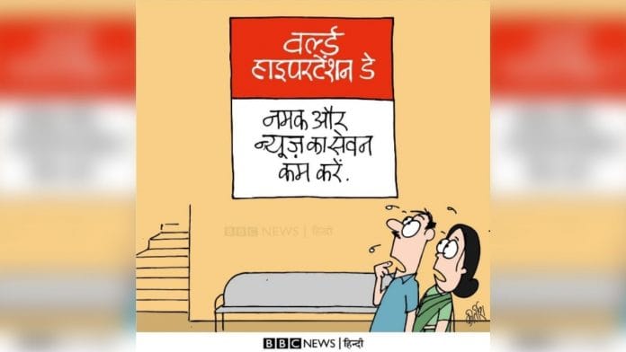 In today’s featured cartoon, Kirtish Bhatt takes a jibe at news outlets for spreading awareness about hypertension and high blood pressure on World Hypertension Day, while also airing news about the record-breaking inflation in India, which is giving the common man sleepless nights.