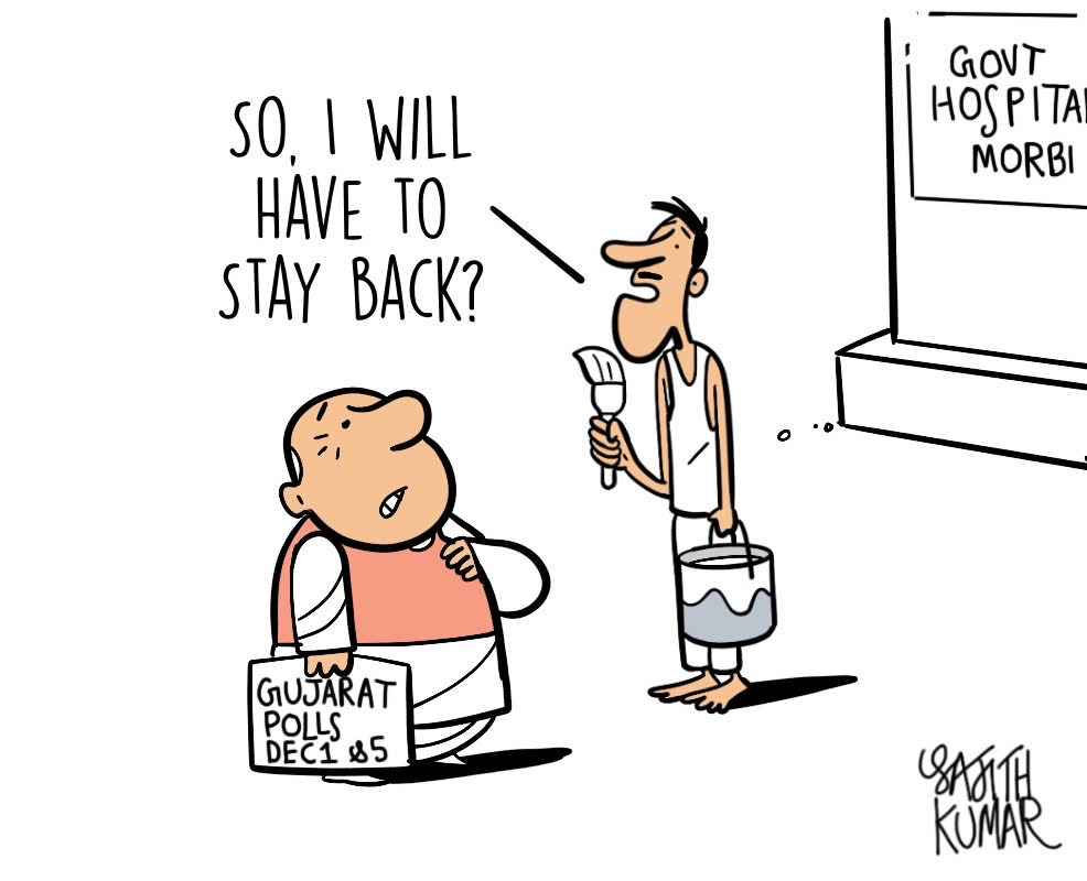 Sajith Kumar uses his canvas to comment on the overnight makeover of a government hospital in Morbi ahead of PM Modi’s visit in the backdrop of the Election Commission declaring the dates for assembly elections in Gujarat.