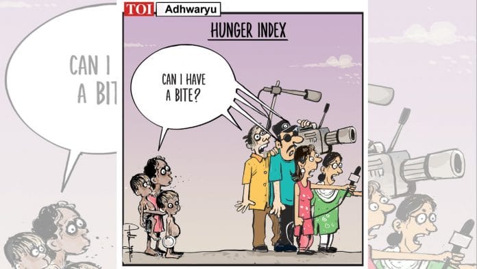 In today’s featured cartoon, Sandeep Adhwaryu puns on ‘bite’ to show that the media is ignoring the actual poor and hungry people in India in its coverage of the country’s dismal showing on the Global Hunger Index 2021.