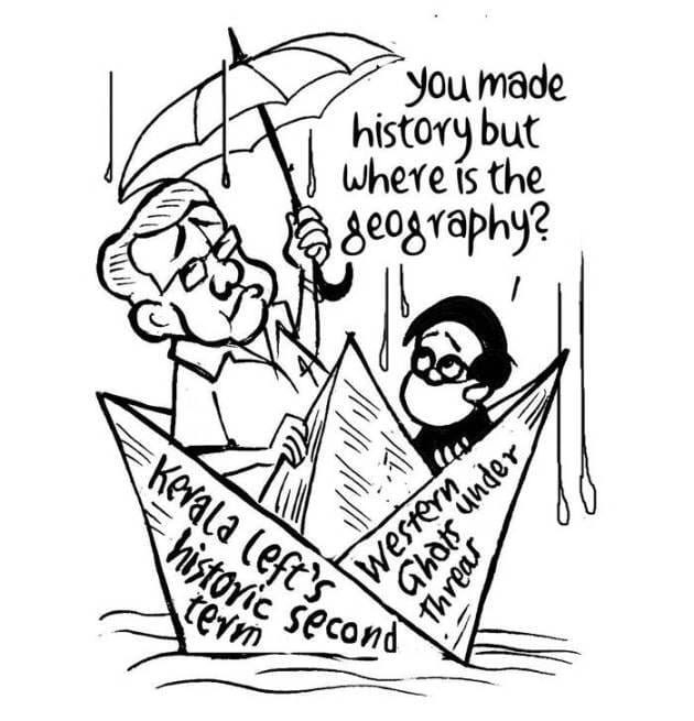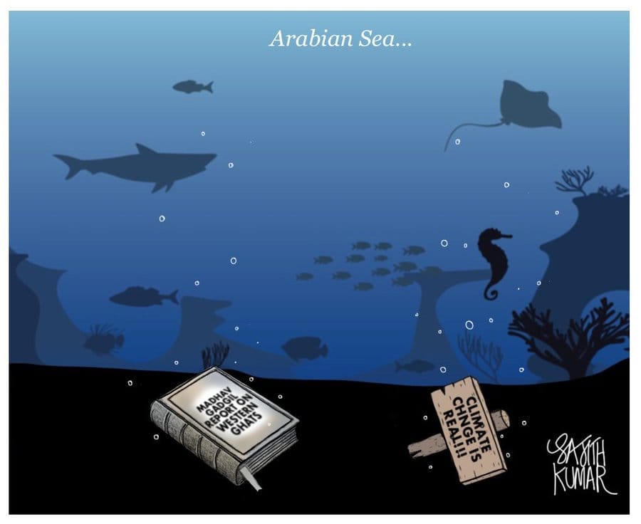 Sajith Kumar comments on the loss of lives and livelihoods in landslides and flash floods in Kerala, and calls it a result of ignoring the 2011 report by ecologist Madhav Gadgil on ways to preserve the Western Ghats, which he depicts as lying at the bottom of the Arabian Sea alongside a ‘climate change is real’ sign.
