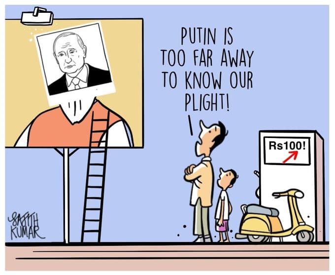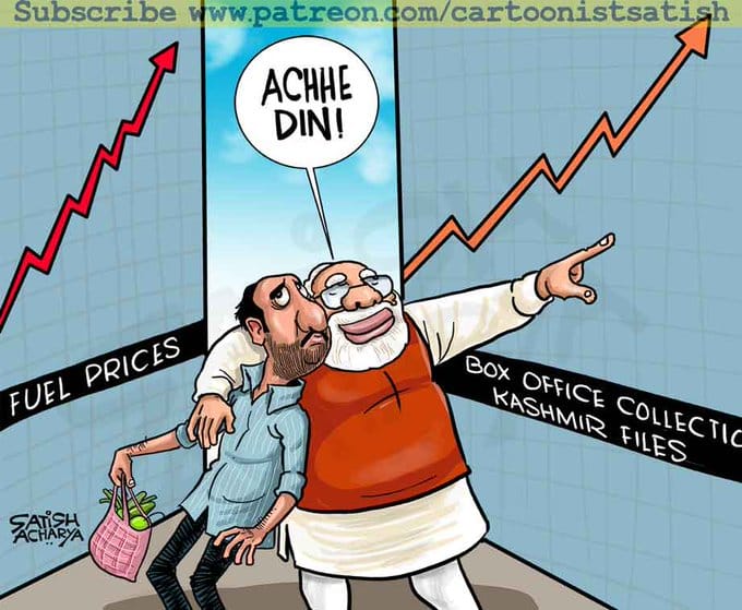 Satish Acharya also takes a dig at rising fuel prices in a tongue-in-cheek comparison with the box office performance of Vivek Agnihotri’s The Kashmir Files — a film based on the exodus of Pandits from the Valley in 1990 — which has been aggressively promoted by the Bharatiya Janata Party (BJP).