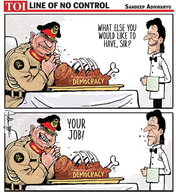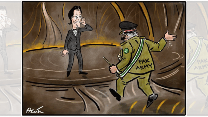 In today’s featured cartoon, Alok Nirantar comments on the Pakistan Army’s influence over the country’s political affairs as he likens Prime Minister Imran Khan’s situation to that of comedian Chris Rock, who was slapped by Hollywood actor Will Smith on stage at the Oscars earlier this week for cracking a joke about his wife Jada Pinkett Smith.