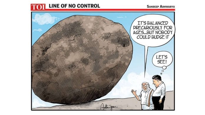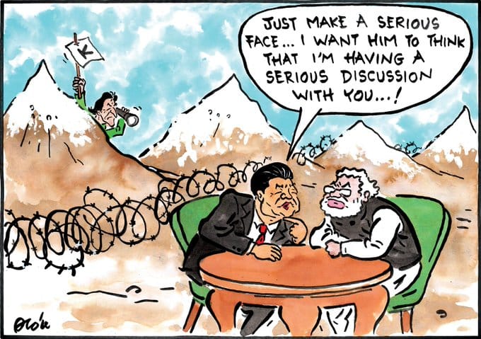 In today’s featured image, Sandeep Adhwaryu alludes to the unsettled border dispute between India and China by illustrating the famed tourist attraction — Krishna’s butterball in the town of Mamallapuram, Tamil Nadu where the Modi-Xi informal summit is going on.
