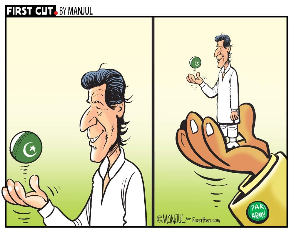 Cartoonist Manjul takes off in a similar path, except it shows Khan tossing a cricket ball that has a Pakistan flag. Khan himself, is shown to be at the mercy of Pakistan Army, shown as a bigger hand.
