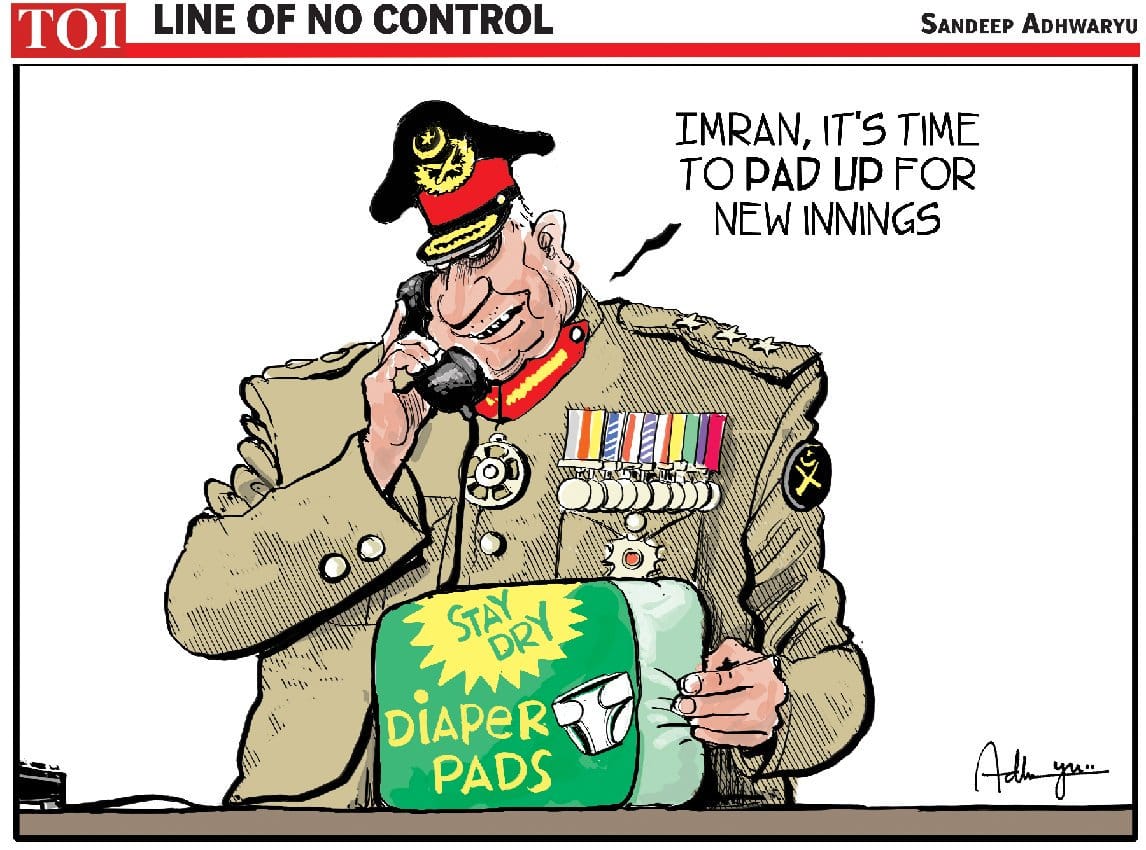 In his Times of India cartoon, a Pakistan army general is shown giving an order to Imran Khan. The general is seemingly asking Khan to pad up to go out and bat, instead he has a pack of diaper pads ready for the prime minister elect.