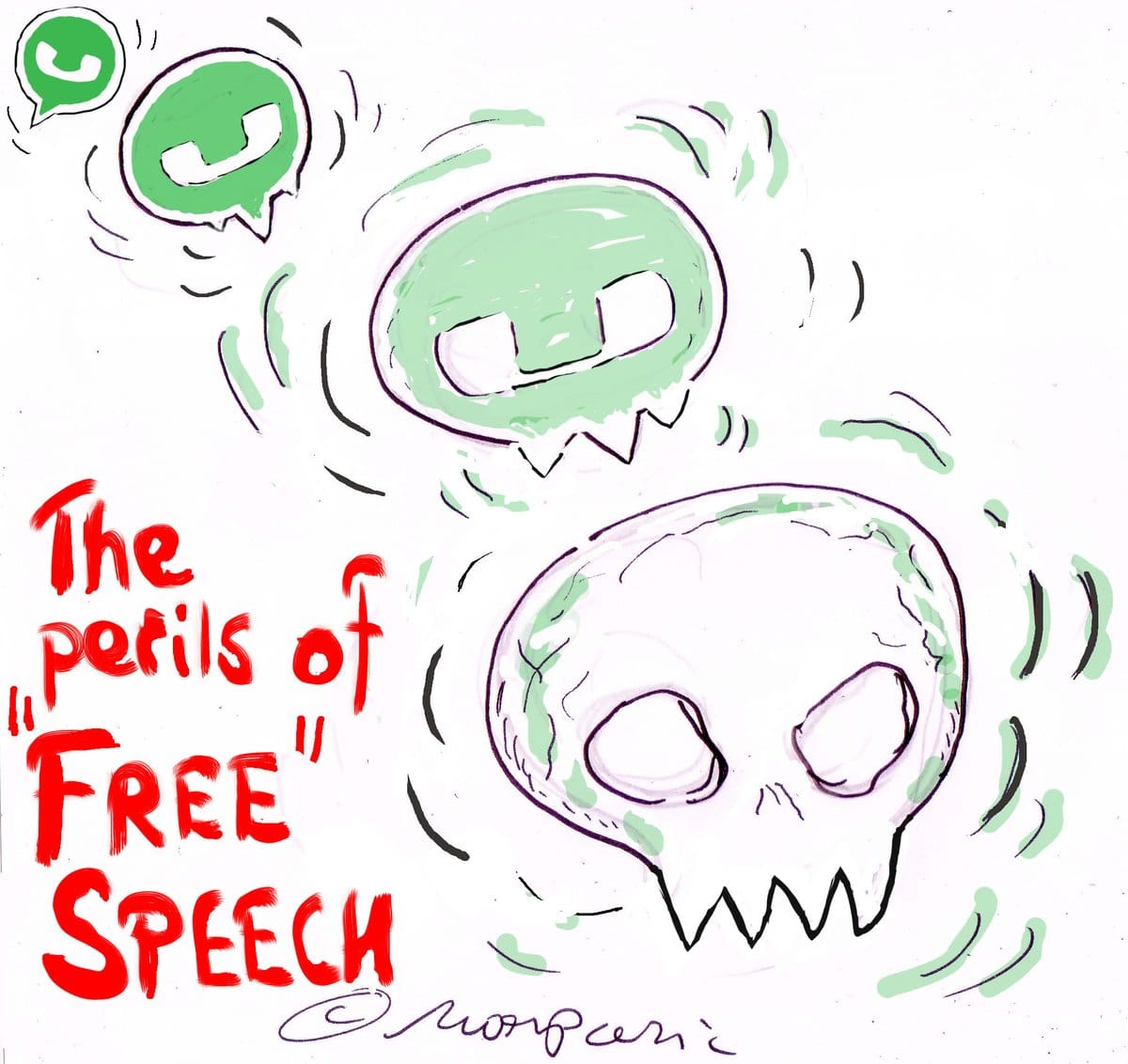 Cartoonist Hemant Morparia illustrates the dangers that come along with free speech on WhatsApp. His cartoon attacks the recent lynchings triggered by rumours spread through Whatsapp messages.