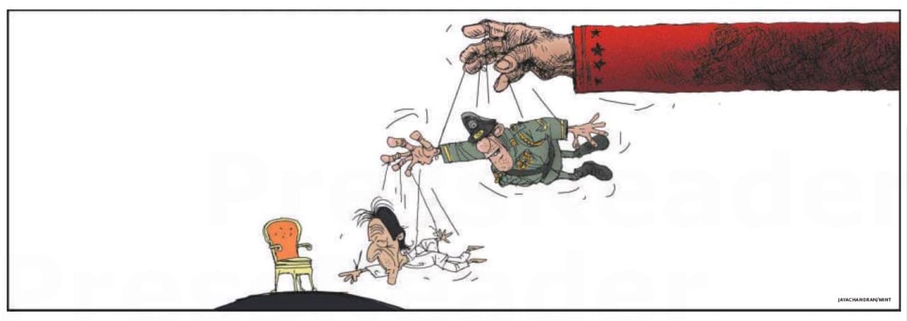 Through his cartoon, Jayachandran shows Imran Khan’s efforts to reach the prime minister’s chair in Pakistan. The Pakistan Tehreek-E-Insaf leader is shown as a puppet of a general in the Pakistan army. The general, in turn, is shown as China’s puppet.