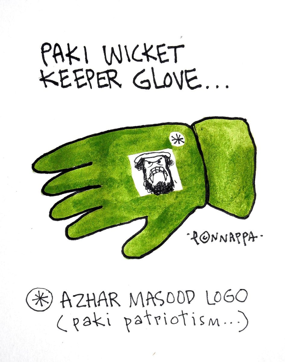 Nala Ponnappa takes a jibe at Pakistan in the wake of the controversy surrounding M.S. Dhoni for sporting the dagger insignia. The cartoonist suggests that a Pakistan’s wicket-keeper’s gloves may feature terrorist Masood Azhar as a sign of patriotism.