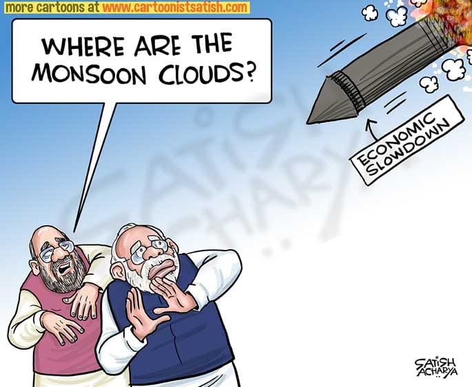 Satish Acharya takes a jibe at Prime Minister Narendra Modi and Home Minister Amit Shah for the economic slowdown by alluding to Modi’s remark made last month that clouds could prevent Pakistani radars from detecting Indian fighter jets during the Balakot air strikes.