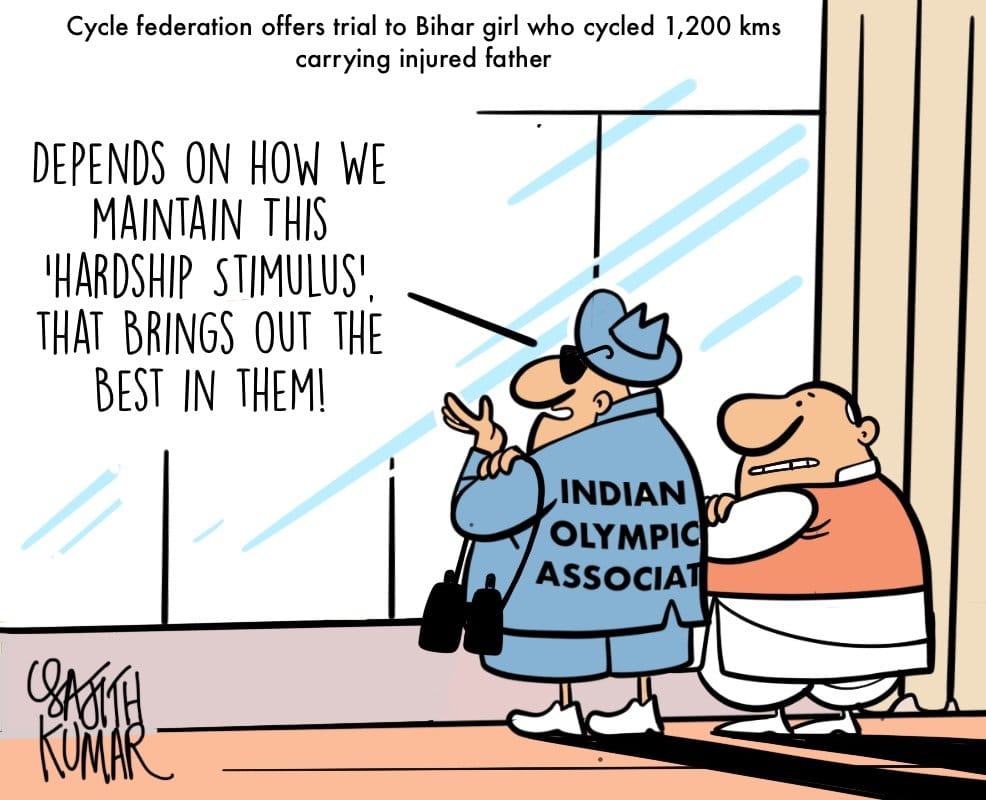 Sajith Kumar takes a dig at the offer made by the Cycling Federation Of India to Jyoti Kumari, who cycled 1,500 km and ferried her injured father to Bihar, and the romanticisation of her suffering.
