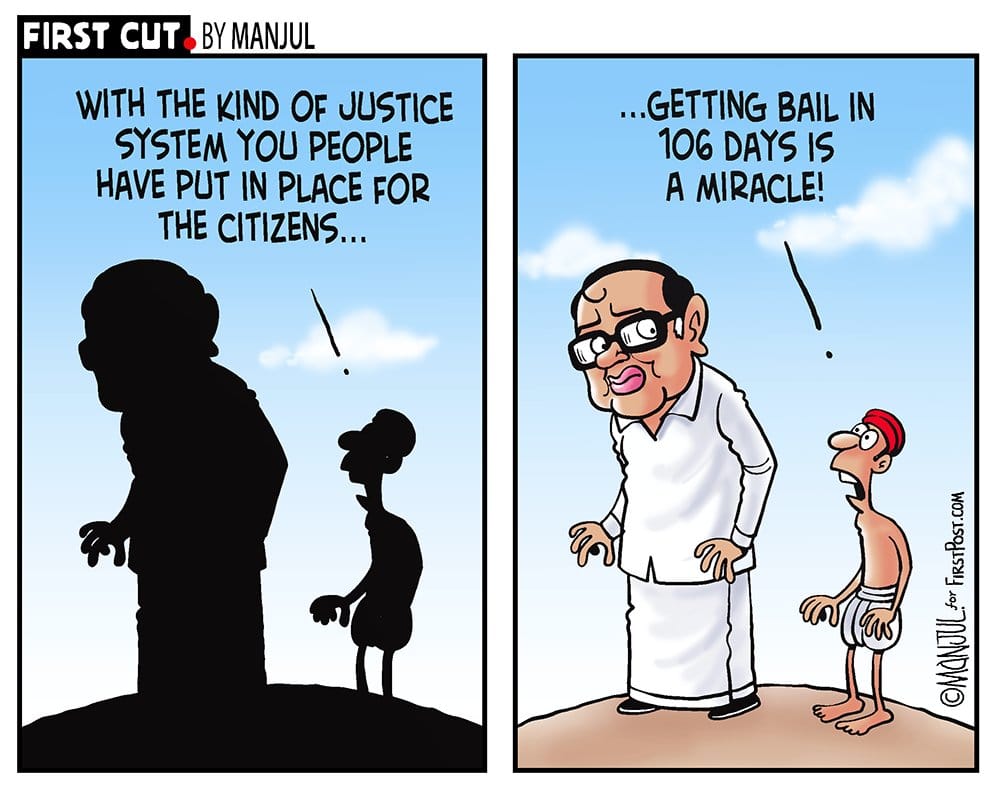 Congress leader and former finance minister P. Chidambaram was given bail Wednesday after being in jail for 106 days. Manjul’s pointed take on India’s justice system.
