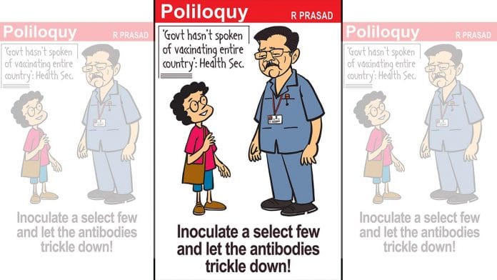 In today’s featured cartoon, R. Prasad takes a swipe at the Narendra Modi government after it recently announced that not everyone will receive the Covid vaccine.