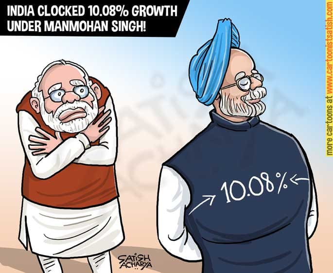 The back-series GDP figures showed that the Indian economy touched 10.08 per cent growth in 2006-07 under former prime minister Manmohan Singh. Satish Acharya illustrates a proud Singh with a widened chest even as PM Narendra Modi tries to modestly cover himself up.