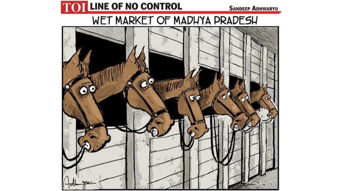 In today’s featured cartoon, Sandeep Adhwaryu calls out the horse-trading that led to the fall of the Kamal Nath government in Madhya Pradesh, which has been rendered cabinet-less in these crucial times. This has led to mismanagement and amplification of Covid-19 cases in the state.