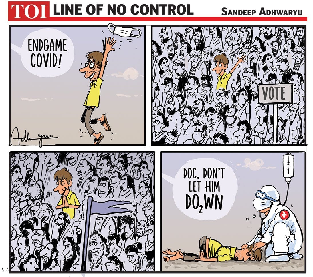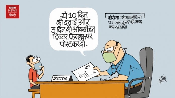 In today’s featured cartoon, Kirtish Bhatt on the efforts of volunteers on social media in helping each other gain access to crucial resources needed for Covid treatment amid shortages.