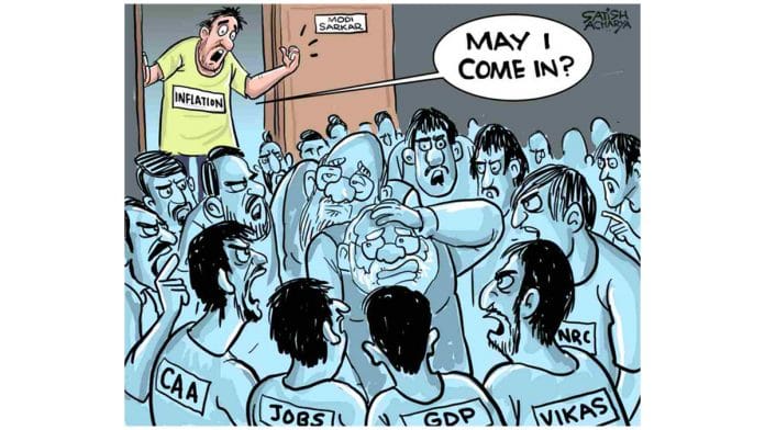 In today’s featured cartoon, Satish Acharya takes a potshot at PM Narendra Modi and Home Minister Amit Shah for their poor governance and issues such as inflation, unemployment and protests against the amended Citizenship Act plaguing the country.