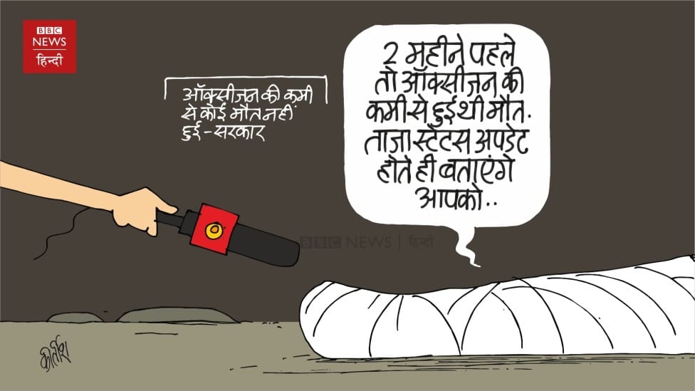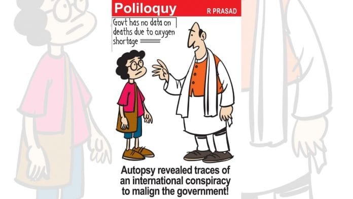 In today’s featured cartoon, R. Prasad refers to the Narendra Modi government’s statement in Rajya Sabha denying deaths in the second wave due to oxygen shortage and draws parallels to its response to the Pegasus controversy.