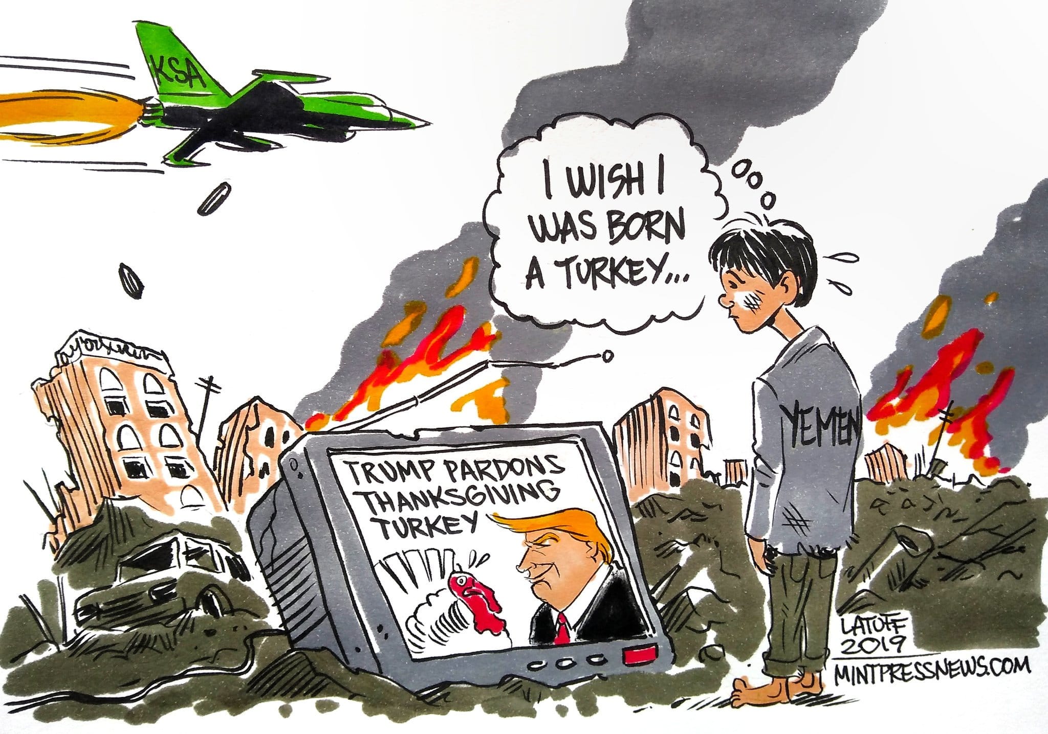 Speaking of Thanksgiving, Latuff illustrates a Yemeni’s wish to rather be a turkey, alluding to the US’s role in the civil war in Yemen. The US has backed the Saudi bombing in the war-torn country.