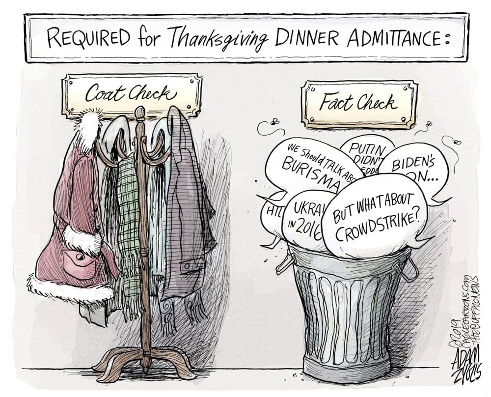 Adam Zyglis indicates that there has been an addition in house rules this Thanksgiving in the US, one that doesn’t involve any fact checking.