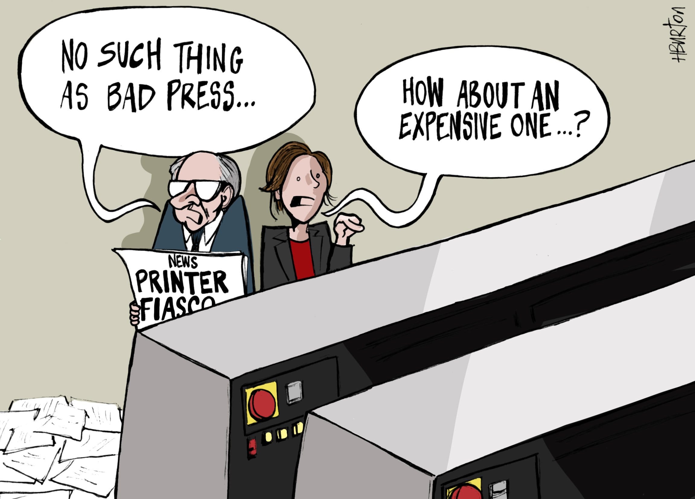 Burton takes a jibe at the €808,000 worth giant printer, which was bought by the Irish Parliament and became a source of ‘bad press’ (quite literally so).