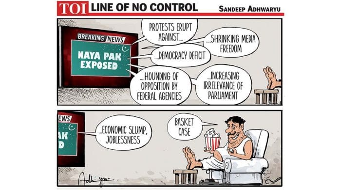 In today’s featured cartoon, Sandeep Adhwaryu illustrates how every average Indian uncle enjoys the ‘exposé’ of Naya Pakistan by most media channels but they don’t realise that the very same problems plague their own country.