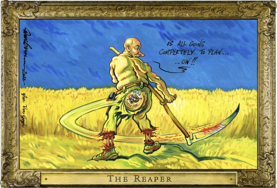 Dave Brown picks on Van Gogh’s famous painting ‘Wheatfield with a Reaper’ (1889) and illustrates Russian President Vladimir Putin as the grim reaper — the image of death — in the sense that humanity is the “wheat” being reaped in broad daylight with a sun that floods the field.