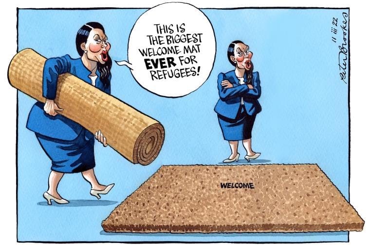 Peter Brookes pokes at the irony of UK Home Secretary Priti Patel, laying the biggest welcome mat for refugees. Patel currently faces call to resign over handling of the Ukraine refugee crisis.
