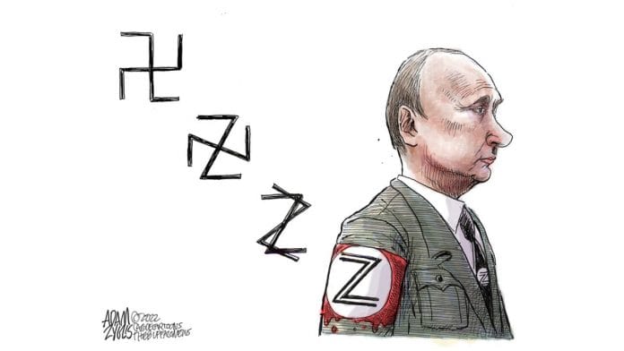 In this week’s featured cartoon, Adam Zyglis draws a parallel between the war crimes committed by German dictator Adolf Hitler and the current aggression by Russia towards Ukraine. The letter ‘Z’ of the Roman alphabet that started to first appear on Russian tanks and military vehicles, have since become a graphic rallying point of the invasion.