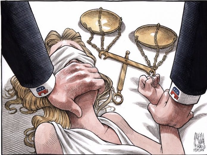 Bruce MacKinnon depicts Lady Justice being assaulted by the Republican Party in the wake of Christine Blasey Ford’s allegations against US Supreme Court nominee Brett Kavanaugh. She has accused Kavanaugh of sexually assaulting her when they were teenagers, but the GOP has backed Kavanaugh to the hilt.