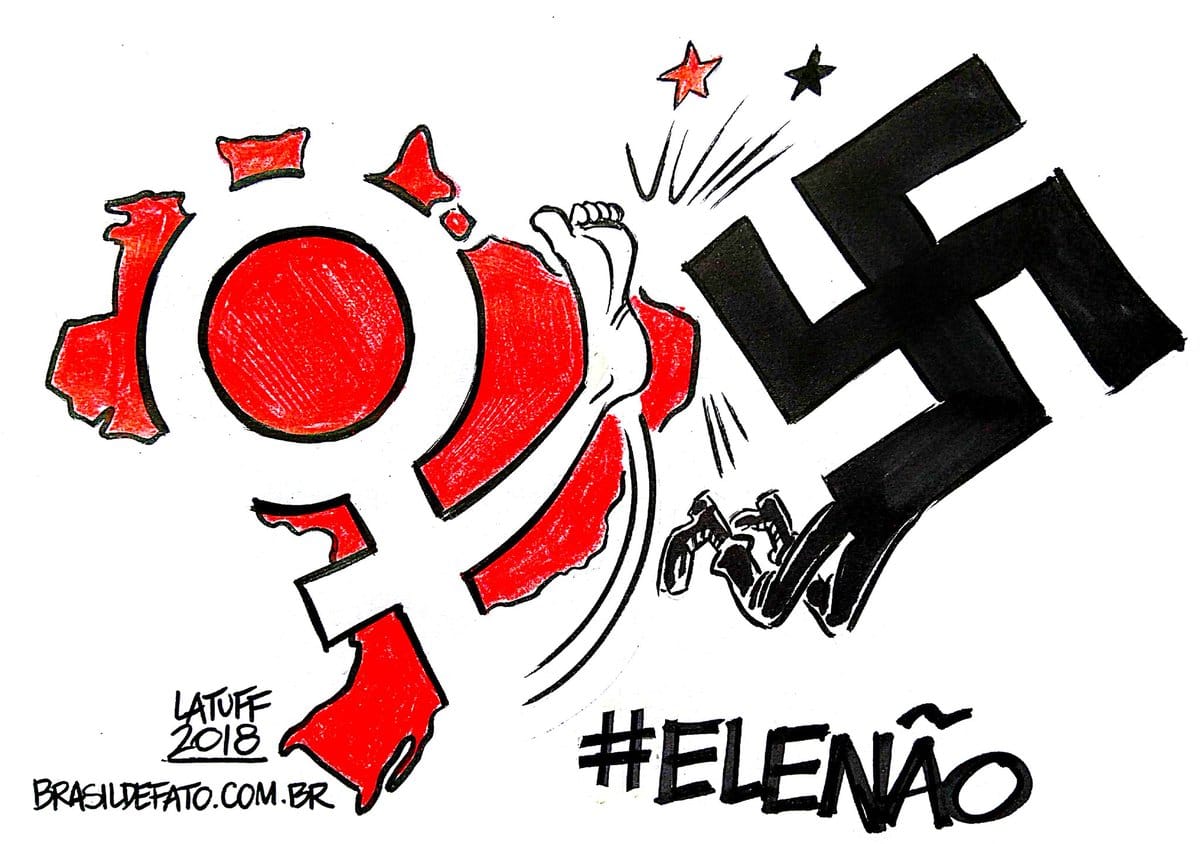 Carlos Latuff reacts to the protest led by women Saturday in Brazil against the candidacy of right-wing frontrunner Jair Bolsonaro in the upcoming presidential elections. People call Bolsonaro racist, misogynist, fascist and homophobic, and Latuff depicts the female symbol kicking out the Nazi swastika.