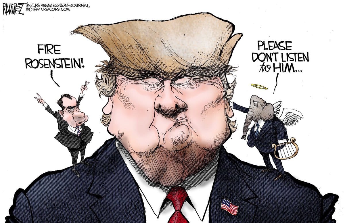 Mike Ramirez depicts Donald Trump’s dilemma over firing deputy attorney general Rod Rosenstein. Rosenstein allegedly suggested secretly recording Trump and invoking the 25th amendment to remove him from the US presidency.