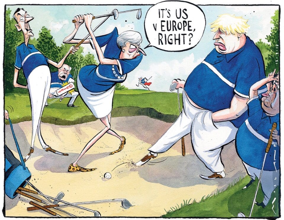 Morten Morland has a take on UK’s former foreign secretary Boris Johnson lashing out at PM Theresa May for her proposed ‘Chequers plan’, whereby she is seeking a common rulebook for the UK and the EU for goods, but not services. Johnson called it deranged and preposterous. Morland refers to the ongoing US vs Europe Ryder Cup golf tournament, and depicts May asking Johnson if it is ‘us’ (the UK) against Europe.