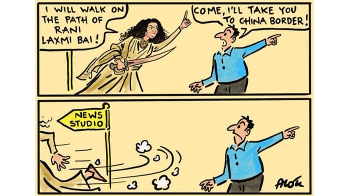 In today’s featured cartoon, Alok Nirantar takes a dig at the ‘discrepancies’ between actor Kangana Ranaut’s ‘bold’ claims of bravery and her actions outside of her social media accounts.