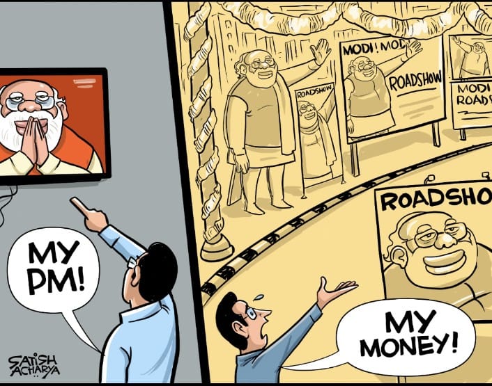 Satish Acharya draws on the recent road show held by Prime Minister Narendra Modi in Bengaluru, ahead of the upcoming Karnataka elections. The BJP originally planned an 8-hour march for Modi but later split it into two parts. The cartoonist hints how people’s taxes are paying for events like roadshows.