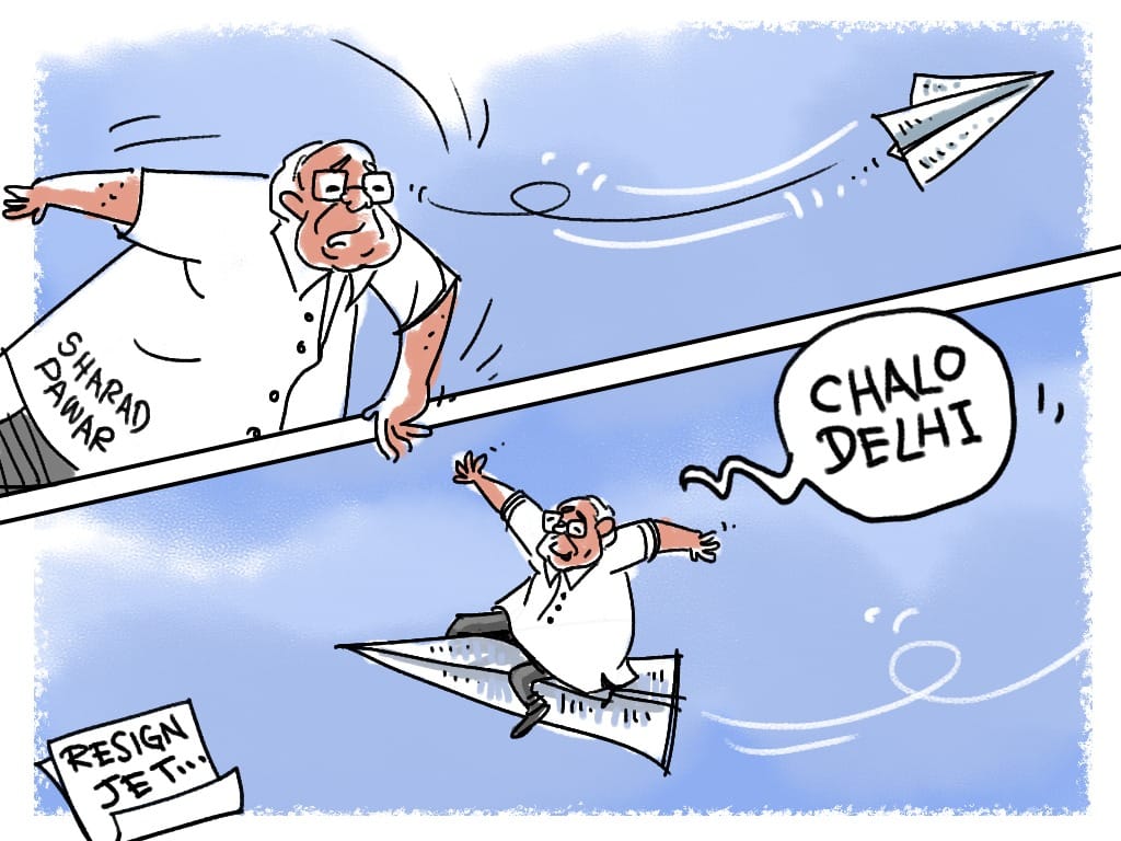 Mika Aziz’s cartoon is a humorous take on NCP chief Sharad Pawar’s recent resignation drama — how he suddenly quit the top post and took back his decision in a matter of three days. The cartoon hints Pawar resigned to forge a greater role in national politics.