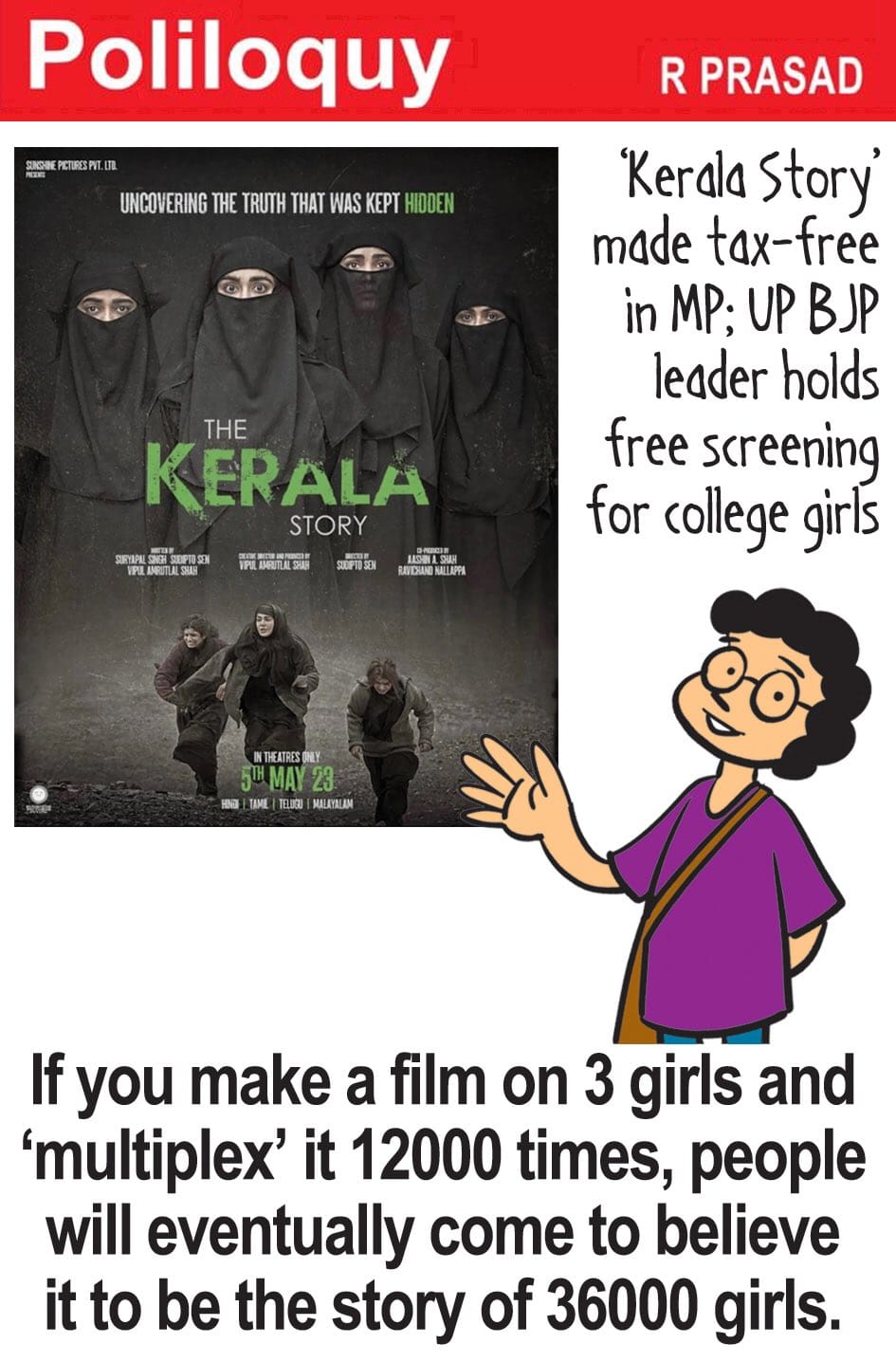 R. Prasad gives his take on the movie “The Kerala Story” being made tax-free in Madhya Pradesh. It also pokes fun at the fact that the filmmakers altered the trailer to ultimately show that three girls had been covnerted. The first trailer put that number at 32,000